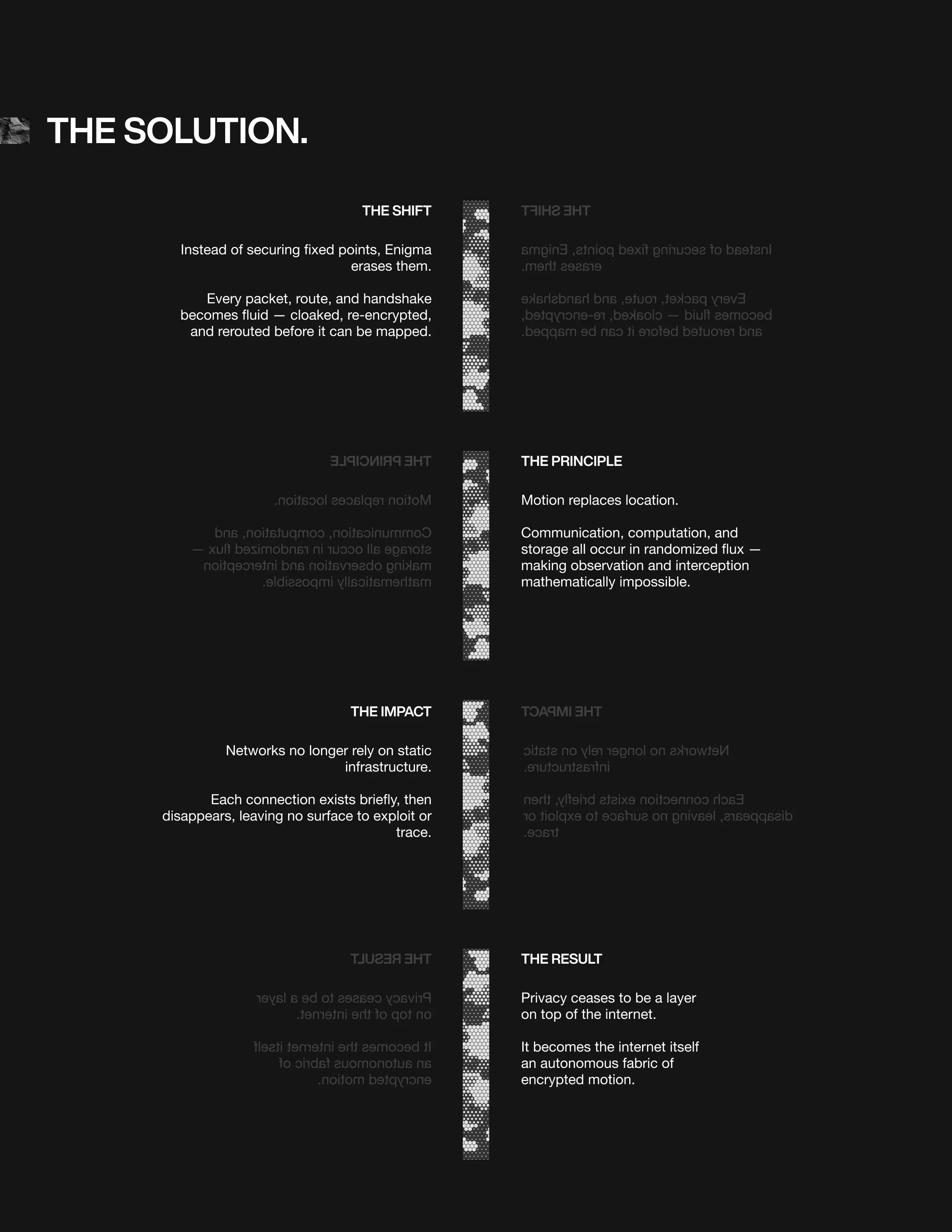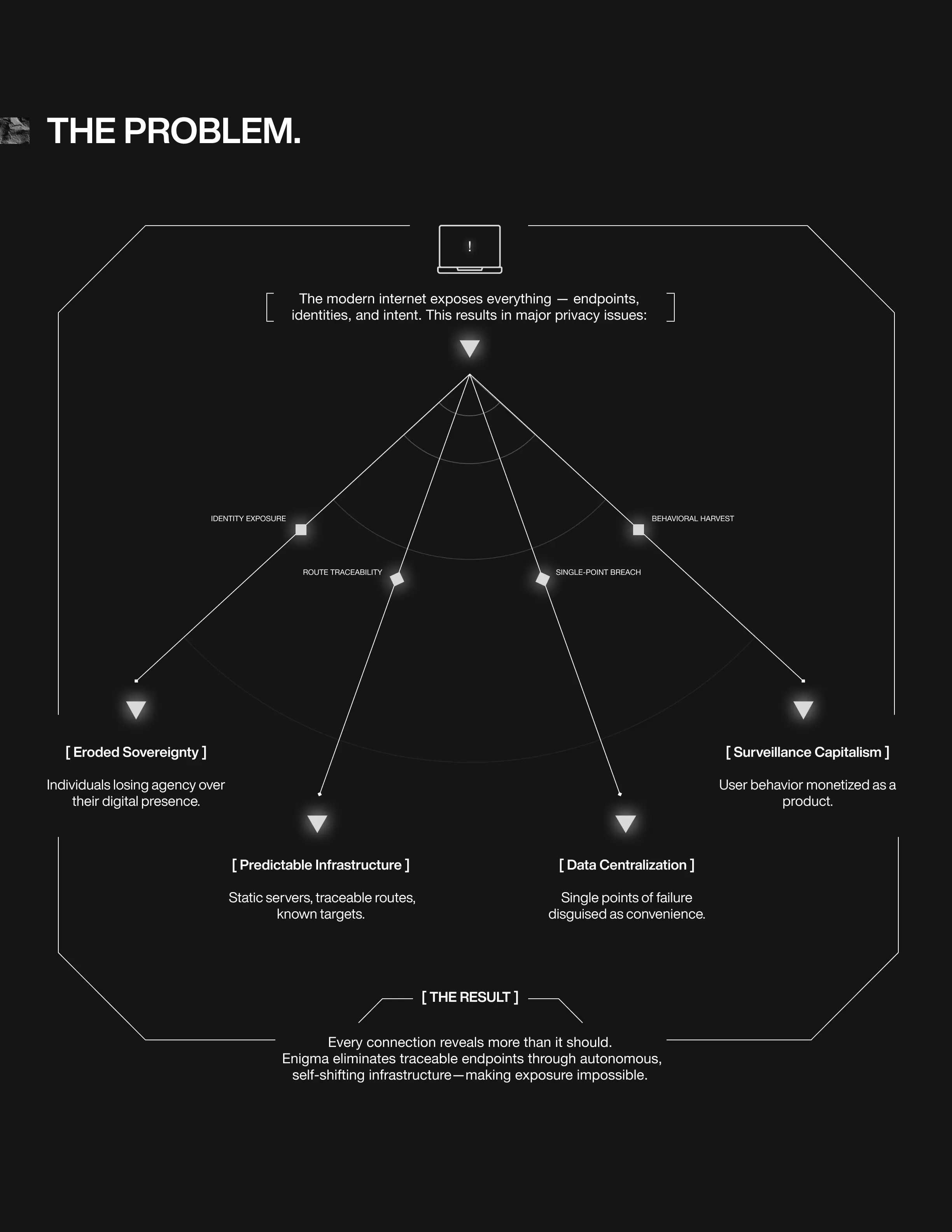 Conventional VPNs are a mirage of safety. They rely on centralized servers that can be blocked, logged, or hacked, and they’re easily detectable by traffic analysis. Enigma’s VPN Replacement uses distributed stealth routing that operates like spread-spectrum communication, packets scattered, pathways rotating, and destinations obscured. To the outside world, there is no tunnel, no endpoint, no signal to find. The infrastructure becomes invisible, and invisibility is the strongest defense.